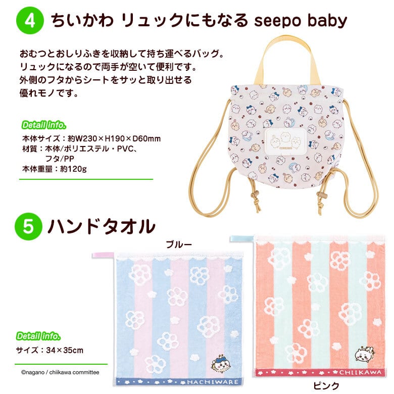 さらに、ちいかわ推しのママさんには嬉しい、おむつとおしりふきを収納できるリュックにもなるバッグとハンドタオルつき。