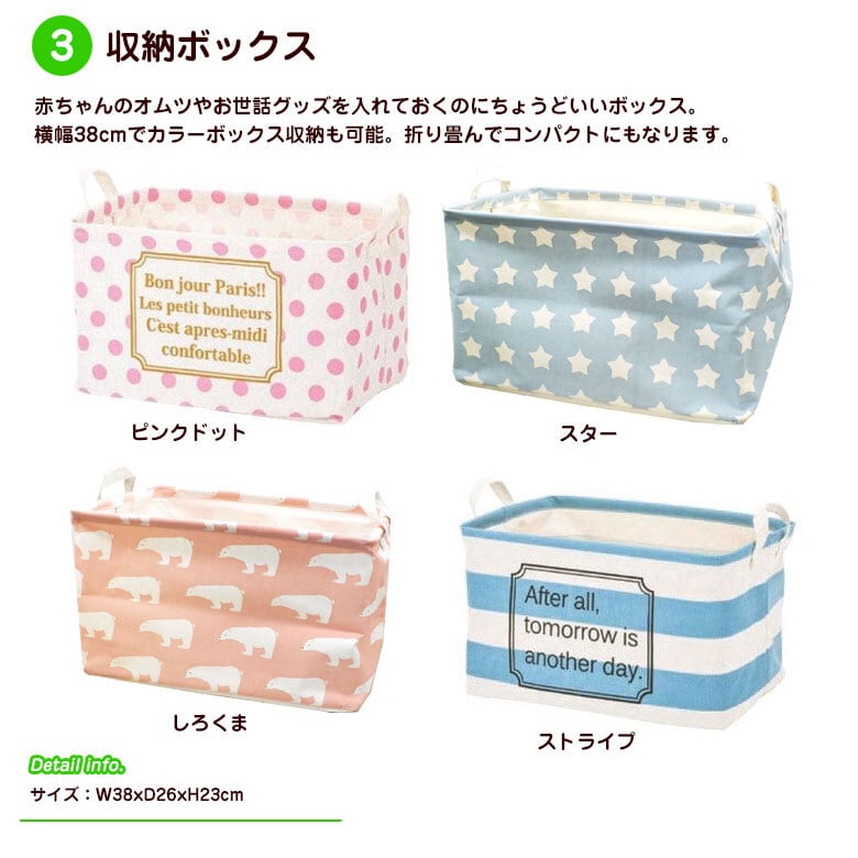 収納ボックスはオムツ入れや赤ちゃんのお世話セット、おもちゃの収納など、育児スペースをスッキリ整理できる嬉しいアイテム。