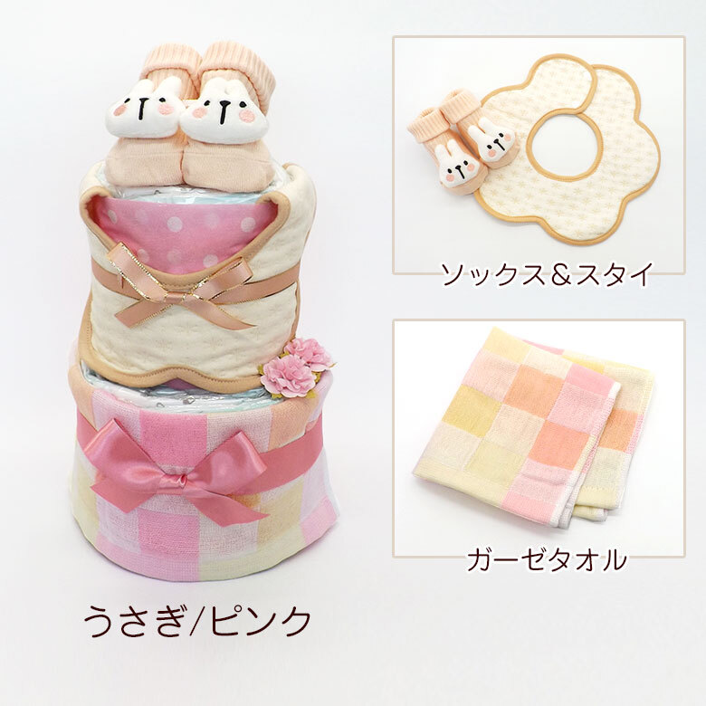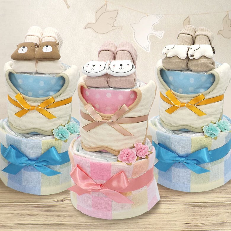 ベビーソックス、スタイ、タオル等、赤ちゃんが使うアイテムが入った2段おむつケーキ。