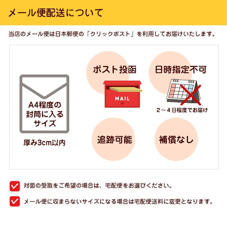 メール便(ポスト投函)でお送りいたします。