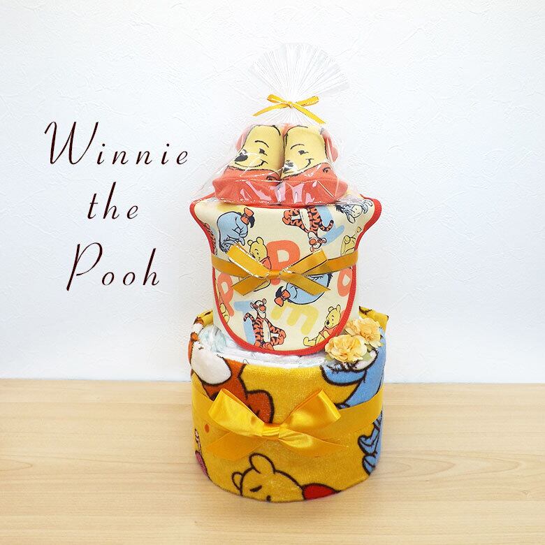 くまのプーさんのスタイ&ベビーソックス、フェイスタオルがついたおむつケーキです。